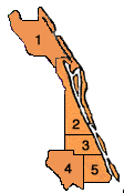 1. Volusia - Daytona Beach, Daytona Beach Shores, DeLand, DeBary, De Leon Springs, Deltona, Edgewater, Lake Helen, Orange City, Ormond Beach, Ormond-By-The-Sea, Holly Hill, New Smyrna Beach, Orange City, Osteen, Pierson, Port Orange, Seville -------------------------------------------------------------------------------- 2. Brevard - Barefoot Bay, Cape Canaveral (Port Canaveral), Cocoa, Cocoa Beach, Grant, Indialantic, Indian Harbor Beach, Malabar, Melbourne, Melbourne Beach, Melbourne Village, Merritt Island, Micco, Palm Bay, Palm Shores, Rockledge, Satellite Beach, Suntree, Titusville, Valkaria, Viera, West Melbourne -------------------------------------------------------------------------------- 3. Indian River - Fellsmere, Florida Ridge, Gifford, Indian River Shores, North Beach, Orchid, Roseland, Sebastian, Vero Beach, Vero Lake Estates, Wabasso Beach, West Vero Corridor, Winter Beach -------------------------------------------------------------------------------- 4. Okeechobee - Cypress Quarters, Okeechobee, Taylor Creek, Up the Grove Beach -------------------------------------------------------------------------------- 5. St. Lucie - Fort Pierce, Fort Pierce South, Hutchinson Island, Lakewood Park, Port St. Lucie, Port St. Lucie-River Park, White City |