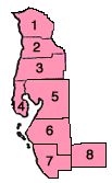 Molino, Muscogee, Myrtle Grove, Pensacola, Pensacola Beach, Perdido Key, Warrington, West Pensecola -------------------------------------------------------------------------------- 2. Santa Rosa - Avalon Beach, Bagdad, Gulf Breeze, Jay, Milton, Munson, Navarre, Pace -------------------------------------------------------------------------------- 3. Okaloosa - Baker, Crestview, Deerland, Destin, Escambia Farms, Fort Walton Beach, Holt, Lake Lorraine, Laurel Hill, Mary Esther, Niceville, Ocean City, Shalimar, Svea, Valparaiso -------------------------------------------------------------------------------- 4. Walton - DeFuniak Springs, Freeport, Miramar Beach, Paxton, Point Washington, Redbay, Santa Rosa Beach -------------------------------------------------------------------------------- 5. Holmes - Bethlehem, Bonifay, Esto, Noma, Ponce De Leon, Westville -------------------------------------------------------------------------------- 6. Washington - Chipley, Ebro, Greenhead, New Hope, Sunny Hills, Vernon, Wausau -------------------------------------------------------------------------------- 7. Bay - Bayou George, Bear Creek, Callaway, Cedar Grove, Fountain, Hiland Park, Laguna Beach, Lynn Haven, Mexico Beach, Millville, Panama City, Panama City Beach, Parker, Rosemary Beach, Sand Hills, Sandy Creek, Southport, Springfield, West Bay, West Panama City Beach, Youngstown -------------------------------------------------------------------------------- 8. Jackson - Alford, Bascom, Campbelltown, Cottondale, Cypress, Graceville, Grand Ridge, Greenwood, Jacob City, Malone, Marianna, Sneads, Two Egg -------------------------------------------------------------------------------- 9. Calhoun - Altha, Blountstown (County Seat), Broad Ranch, Carr, Chason, Chipola, Chipola Park, Clarksville, Cox, Frink, Henderson Mill,Kinard, Marysville, McNeal, Ocheesee Landing, Selman, Willis -------------------------------------------------------------------------------- 10. Liberty - Bristol, Estiffanulga -------------------------------------------------------------------------------- 11. Gulf - Dalkeith, Highland View, Port St. Joe, Wewahitchka, White City -------------------------------------------------------------------------------- 12. Franklin - Alligator Point, Apalachicola, Carrabelle, Eastpoint |